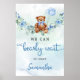 The watercolor cute teddy bear swinging on a eucalyptus wreath with dusty blue flowers is a charming theme for a boy baby shower. This design can be used for a welcome porch sign or a large format poster, creating a whimsical and welcoming atmosphere for the celebration. The soft colours and adorable imagery make it a perfect choice for a sweet and memorable event.