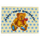 This fuzzy, little bear is an original acrylic wash, on watercolor paper is one of my paintings. The teddy bear art is overlaid on a background of blue stars. The arched text, 'BABY'S FIRST BIRTHDAY', can be personalized with a child's name, your text or removed. The background color can also be customized.