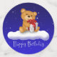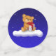 A cute teddy bear holding a gift box is sitting on a cloud in front of a blue night sky with brigh stars and moon.