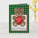 This adorable teddy bear is perfect for baby's first holiday or any toddler. This cuddly, brown bear is holding a red ornament, that read "Merry Christmas". The background is a green and black check plaid, with a white box. The text on the bottom, of the front panel and the text inside can be customised.