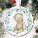 On this cute Christmas ornament, an adorable little brown teddy bear wears a winter scarf. The bear is surrounded in a blue leaf and red berry wreath. The back of the ornament holds your custom text in five easy to change fields. Cute for any child, especially a toddler or baby. Be sure to see the matching ornaments in our store.