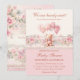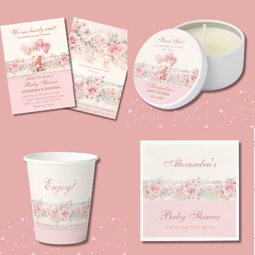 Celebrate the joyous occasion of your Baby Shower with this personalized floral, christian invitation. Adorned with delicate blush pink flowers and soft greenery against a dreamy dusty pink background, it is the essence of shabby chic elegance. At the center of attention is a cute pink teddy bear clutching a bunch of whimsical balloons, adding an adorable touch to the design. The back features a soft, floral background and the Bible Verse Scripture Psalm 119:14 "Fearfully and wonderfully made." Set the tone for a soft, feminine baby shower party or picnic you and your treasured guests will love, with this inivite.