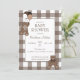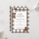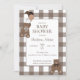 If you can "bearly" wait for the arrival of baby, customize this shades of chocolate brown, tan, and white buffalo check (plaid), teddy bears, ribbon bows, and balloons baby shower invitation. The back of the card features the same gingham background.