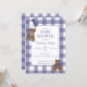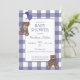 If you can "bearly" wait for the arrival of baby girl, customize this shades of purple and white buffalo check (plaid), teddy bears, ribbon bows, and balloons baby shower invitation. The back of the card features the same gingham background.