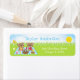 This cute and whimsical address label features adorable bears having a picnic on a blue gingham cloth with treats such as honey, watermelon, strawberry jam, lemonade and pie. In the background is a bright blue sky and sunshine, butterflies and daisies. The text combines decorative and serif fonts for a stylish and modern look.