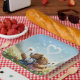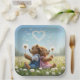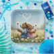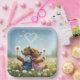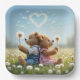 Two teddy bears dressed in charming outfits sit back to back in a field filled with blooming dandelions and floating seedlings in the shape of a heart in the sky.