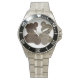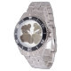 Has heft and feel of expensive stainless steel quartz watches. Good band with safety catch.  I removed links, which is easy because engraved arrows show direction to push the linking pins. As always by this seller, the image (a railroad logo) is a perfect reproduction of my emailed image, and is precisely spaced and aligned.