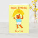 Card for any young child. An orange teddy bear holding a yellow banner with childs age, customisable. Add name to front of card, any extra message and names inside.Shown here with name Cassius and age four. Easily change age and name.