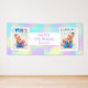 Colourful teen girl birthday banner with a bright colour stripe background with lines in bright blue, pink, purple, and yellow tones. Personalised with her name, age, and 2 photos.