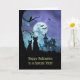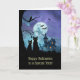 A Halloween card for a teenager featuring two cats and an owl with glowing eyes, all silhouetted against a big full moon. In the background, a fun yet spooky house adds to the eerie atmosphere.