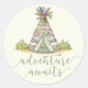 Cute Tribal adventure begins baby shower favour sticker featuring a teepee & modern typography in yellow for a neutral shower.