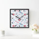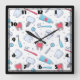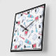 A clock with a dental themed pattern. Featuring colourful illustrations of teeth, toothbrushes, and various dental tools.