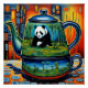A.I. created surreal print of a Panda peeking out from a colorful teapot, surrounded by a vibrant mosaic of geometric shapes, patterns of bold hues.
