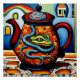 A.I. created surreal print of a Panda peeking out from a colorful teapot, surrounded by a vibrant mosaic of geometric shapes, patterns of bold hues.