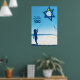 The sea, the beach, and youth are iconic images of the ever-young State of Israel. This poster incorporates all three as a silhouetted youth flies a Star of David-shaped kite on the beach of Tel Aviv. The text reads Tel Aviv Celebrates 100.