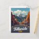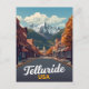 Experience the charm of the Rocky Mountains with this stunning vintage-style travel postcard for Telluride, Colorado. The artwork captures the iconic view down the historic Main Street, lined with classic brick buildings and glowing with autumn colors, leading straight toward the dramatic, snow-capped peaks of the San Juan Mountains. This design is perfect for ski enthusiasts, fall foliage admirers, Colorado travelers, and collectors of retro destination art. A picturesque piece that captures the historic beauty and majestic setting of this famous mountain town.