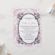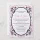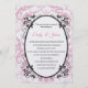 Shown in an ever popular Pearl shimmer, this invite has a Pastel Pink Coronation pattern printed in the background on the front and on the back. A Black Oval with fancy leaf-vine work frames the text inside. Bride and Groom's names are highlighted in a soft Pink. Body of text shown in Black. Choose your paper choice and customise from their if desired.