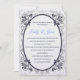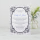 Shown in an ever popular Pearl shimmer, this invite has a Pastel Silver-Grey Coronation pattern printed in the background on the front and on the back. A dark Sapphire Oval with fancy leaf-vine work frames the text inside. Bride and Groom's names are highlighted in a soft Blue. Body of text shown in deep Sapphire Blue. Choose your paper choice and customise from their if desired.