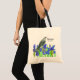 A tote bag decorated with a mockingbird in a bed of royal blue iris flowers drawn with ink and painted with watercolor. Inspired by the state bird and state flower of Tennessee. You can edit or remove the text to fit your needs.