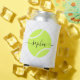 Personalised can cooler beer insulator with a bright yellow green tennis ball and net background pattern with an elegant calligraphy script monogram name and custom text, perfect for the tennis player or team merch and awards nights or tennis camp.