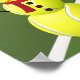 This humourous tennis design features a tennis ball snowman with a racket for an arm on a green tennis court.