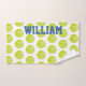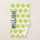 Tennis player's sweat hand towel done in white with a yellow tennis ball pattern. Bold large blue text is ready to personalise to read what you want.