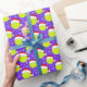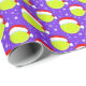 This Christmas wrapping paper features tennis balls wearing Santa's hat with snowflakes twirling around on a Christmas purple background.