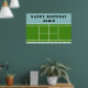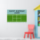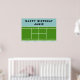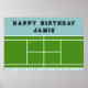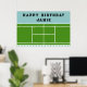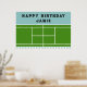 Creative tennis-themed happy birthday poster featuring tennis court on light-blue background. To personalise edit text to add name or otherwise customise.