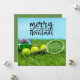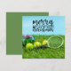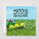 Tennis Christmas with tennis ball gift ornament Holiday Card and golden racket on green grass