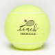 Personalised coach tennis balls with a custom name in an elegant feminine girly and modern pretty script font and simple tennis racquet and ball design. Any tennis coach, instructor, or counsellor would appreciate the elegant look on these modern tennis balls as a thank you gift or keepsake after a coaching session or skills and drills clinic.