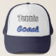 Tennis Coach. Vrolijke pet. Kleuren: blauw, wit en zwart. Leuk om als trotse trainer te dragen.