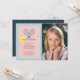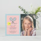 This cute "Game, set, match!" girl's photo birthday invitation features a pair of racquets, a ball on a tennis court background in pink and blue. The reverse side features a navy blue background with white polka dots. Personalise for your needs. You can find more matching products at my store.