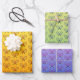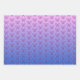 These are bright colourful sheets of wrapping paper with a tennis theme. The sheets have a pattern of tennis rackets and balls on an ombre background: Red rackets on yellow/orange; blue rackets on yellow/green ; and pink rackets on pink/blue.