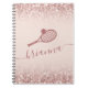 Pretty pink tennis racket and ball monogram notebook design with a modern and trendy rose gold glitter border and girly feminine script name personalisation.
