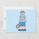 A cartoon of a tennis player boy, this boy is really into tennis, he has a tennis ball picture on his top and he is holding a tennis racket. He is dressed mainly in blue.