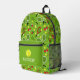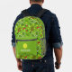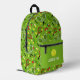 Colourful lime green backpack patterned with tennis racquets, tennis balls and strawberries. The front pocket area has customisable text for you to add your name or initials