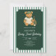 The retro calligraphy heading Beary First Birthday adds a nostalgic touch, beautifully complemented by the green and white striped background reminiscent of vintage tennis attire.