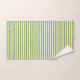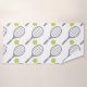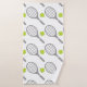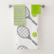 Tennis racket and ball custom bath towel set featuring a pattern of a grey racket, a green tennis ball on white background. The hand towel displays stripes in grey, green and white while the washcloth is of green solid colour. A cool gift for the tennis player or tennis lover in your life. Some elements courtesy of vectorportal.com.
