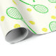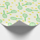 Wrapping paper for tennis lovers has green tennis rackets and yellow tennis balls in a scattered pattern.