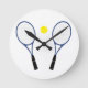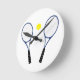 A graphic illustration of blue tennis rackets and a yellow tennis ball a great wall clock for the tennis/sport enthusiast