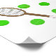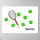 A cool design for a tennis player. A tennis racquet and several green tennis balls. The saying 'tennis' in the bottom corner can be changed if so desired.