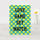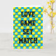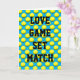 A playful anniversary for a couple who love tennis! Love, game, set, match. Yellow tennis balls on a vibrant blue background. The message inside can be personalised with a name or message of your choosing.