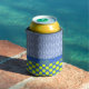 Tennis balls create a bright polka dot pattern on a blue background on both the front and the back of this fun can cooler for tennis fans. On the front, tennis rackets are also used in a complementary pattern, and there is a blue stripe for you to personalise with a name or other text.