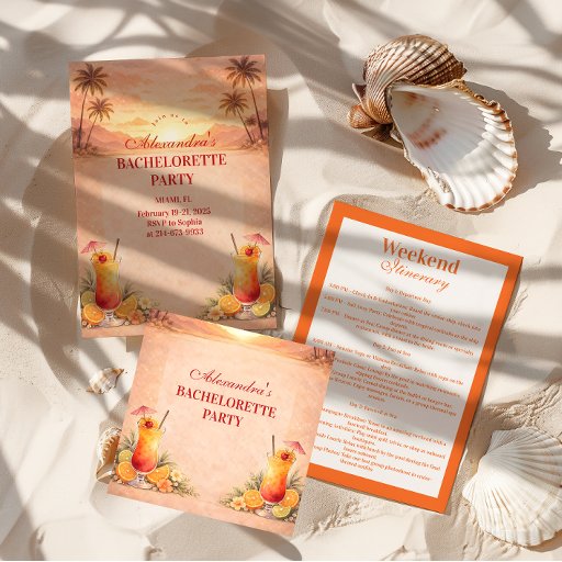 Set the vibe for a sun-soaked getaway with this Tequila Sunrise–inspired bachelorette design, featuring a warm tropical sunset palette, palm silhouettes, and vibrant cocktail illustrations. Perfect for Miami weekends, beach destinations, or any girls’ trip that starts at golden hour and ends with margaritas.