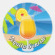 A glass of tequila sunrise cocktail on a tropical beach background.
