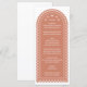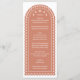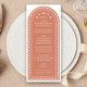 If you're dreaming of an elegant fall wedding, this menu card is for you. This romantic arch wedding menu features a delicate design reminiscent of blossoms and fluttering leaves and beautiful typography. The terra cotta colour creates a rich, earthy warmth, complementing the natural colours of the autumn season.