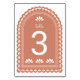 This romantic arch table number features a delicate design reminiscent of blossoms and fluttering leaves. Your wedding guests will love arriving at their table to see this charming table sign. The terra cotta colour creates a rich, earthy warmth, and is a perfect complement to the natural colours of the fall season. A lovely addition to your Mexican or southwestern wedding reception.