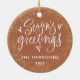 This festive double-sided ornament features a full photo and fun lettering. The front features a full family photo. On the back, white lettering reads "Season's Greetings" with your name and holiday year below. The typography design is framed by a gold wreath against a terracotta background.