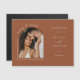 This beautiful Save the Date magnetic card features an elegant modern minimalist style with a clean and simple block serif typography fonts in an arch shape around the photo on a terracotta background for a clean minimalist and modern look which is a beautiful way to inform about your upcoming wedding. Announce to your family and friends you are getting married with this save the date magnetic card and add a personal touch with beautiful pictures of you and your soon-to-be better half. The simplicity of this design adds a touch of elegance to your wedding. It works well with many wedding themes and definitely a great addition to your wedding. Just customise the names and wording in a few easy steps and personalise the magnetic card with your photo of the happy couple.