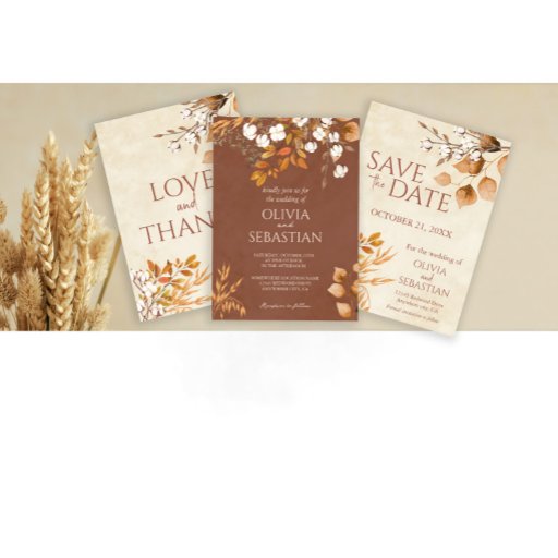 Modern bohemian style wedding design featuring watercolor fall leaves in earthy tones like rust brown, burnt orange and terracotta. The text can easily be personalized for a unique one of a kind design for your special day.